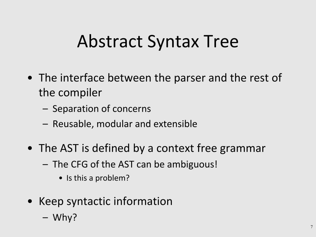 Abstract Syntax Tree • The interface between the parser and the rest of the compiler • Separation of concerns • Reusable, modular and extensible • The AST is defined by a context free grammar • The CFG of the AST can be ambiguous! • Is this a problem? • Keep syntactic information • Why?