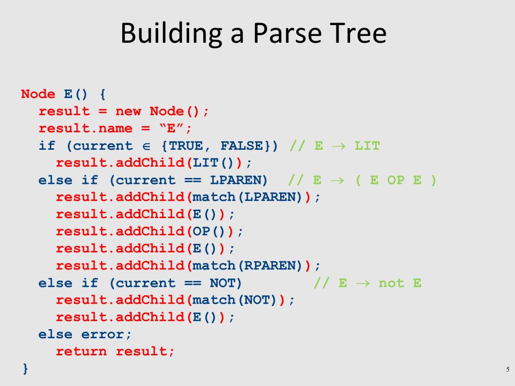 Building a Parse Tree NodeE() { result = new Node(); result.name = “E”; if (current {TRUE, FALSE}) // E LIT result.addChild(LIT()); else if (current == LPAREN) // E ( E OP E ) result.addChild(match(LPAREN)); result.addChild(E()); result.addChild(OP()); result.addChild(E()); result.addChild(match(RPAREN)); else if (current == NOT) // E not E result.addChild(match(NOT)); result.addChild(E()); else error; return result; }