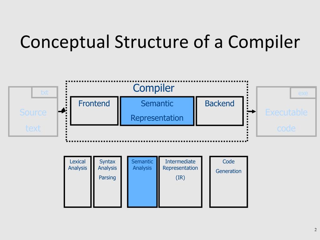 Source text txt Executable code exe Conceptual Structure of a Compiler Compiler Frontend Semantic Representation Backend LexicalAnalysis Syntax Analysis Parsing Semantic Analysis IntermediateRepresentation (IR) Code Generation