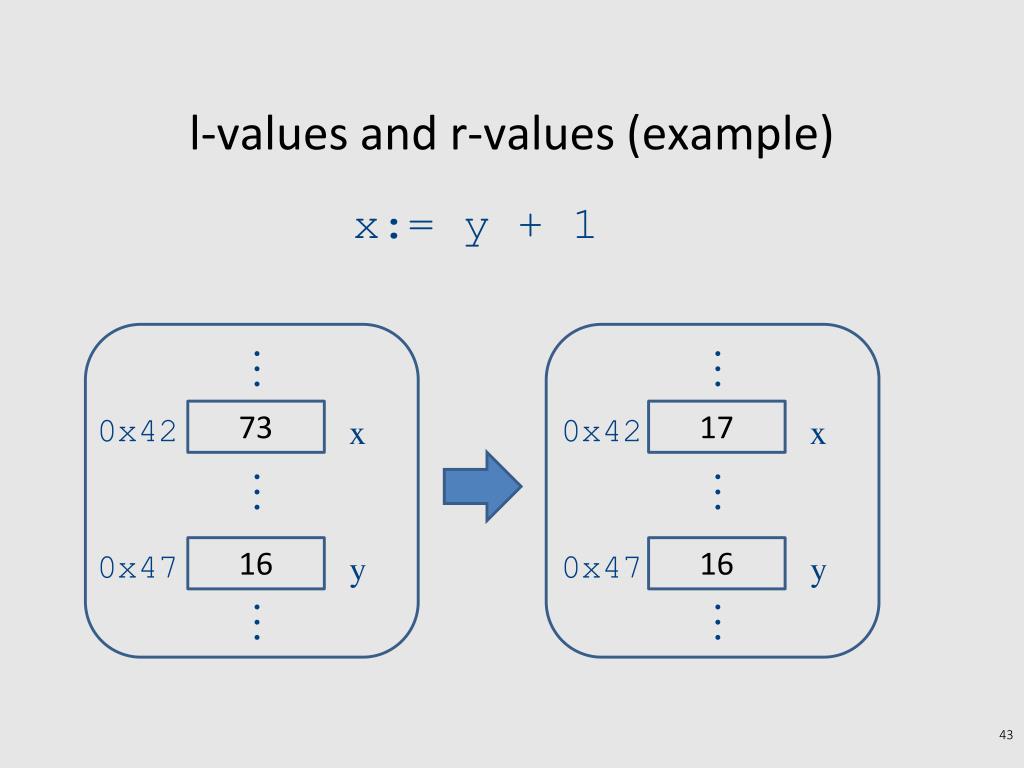 l-values and r-values (example) x:= y + 1 … … 73 17 0x42 x 0x42 x … … 16 16 0x47 y 0x47 y … …