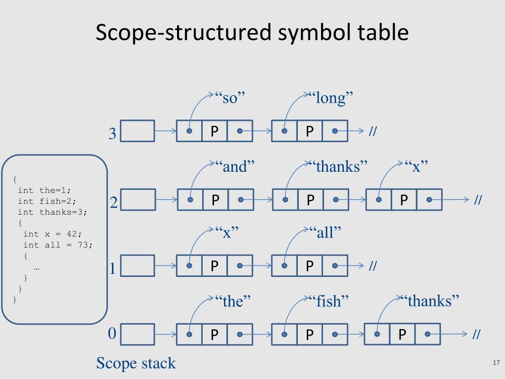 Scope-structured symbol table “so” “long” // 3 “and” “thanks” “x” { int the=1; int fish=2; int thanks=3; { int x = 42; int all = 73; { … } } } P P P P P P P P P P // 2 “x” “all” // 1 “thanks” “the” “fish” 0 // Scope stack