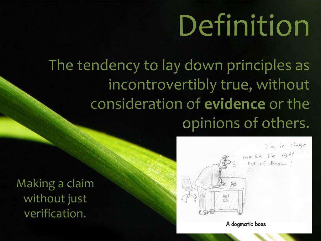 Dogmatism. Miranda Craft. Definition. The tendency to lay down principles as incontrovertibly true, without consideration of evidence or the opinions of others. Making a claim without just verification. Examples.