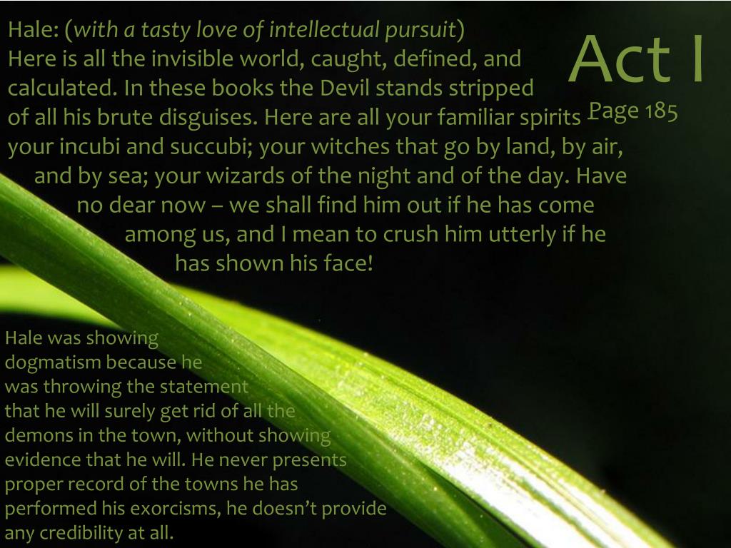 Act I Hale: (with a tasty love of intellectual pursuit) Here is all the invisible world, caught, defined, and calculated. In these books the Devil stands stripped of all his brute disguises. Here are all your familiar spirits – your incubi and succubi; your witches that go by land, by air, and by sea; your wizards of the night and of the day. Have no dear now – we shall find him out if he has come among us, and I mean to crush him utterly if he has shown his face! Page 185 Hale was showing dogmatism because he was throwing the statement that he will surely get rid of all the demons in the town, without showing evidence that he will. He never presents proper record of the towns he has performed his exorcisms, he doesn’t provide any credibility at all.