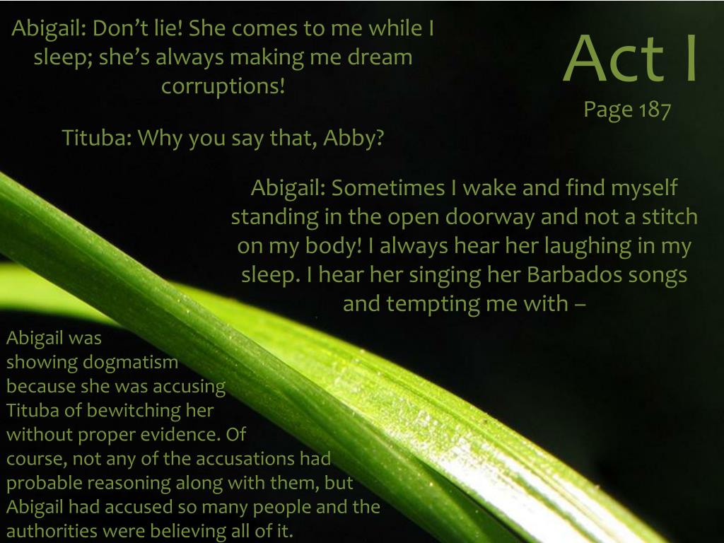 Abigail: Don’t lie! She comes to me while I sleep; she’s always making me dream corruptions! Act I Page 187 Tituba: Why you say that, Abby? Abigail: Sometimes I wake and find myself standing in the open doorway and not a stitch on my body! I always hear her laughing in my sleep. I hear her singing her Barbados songs and tempting me with – Abigail was showing dogmatism because she was accusing Tituba of bewitching her without proper evidence. Of course, not any of the accusations had probable reasoning along with them, but Abigail had accused so many people and the authorities were believing all of it.