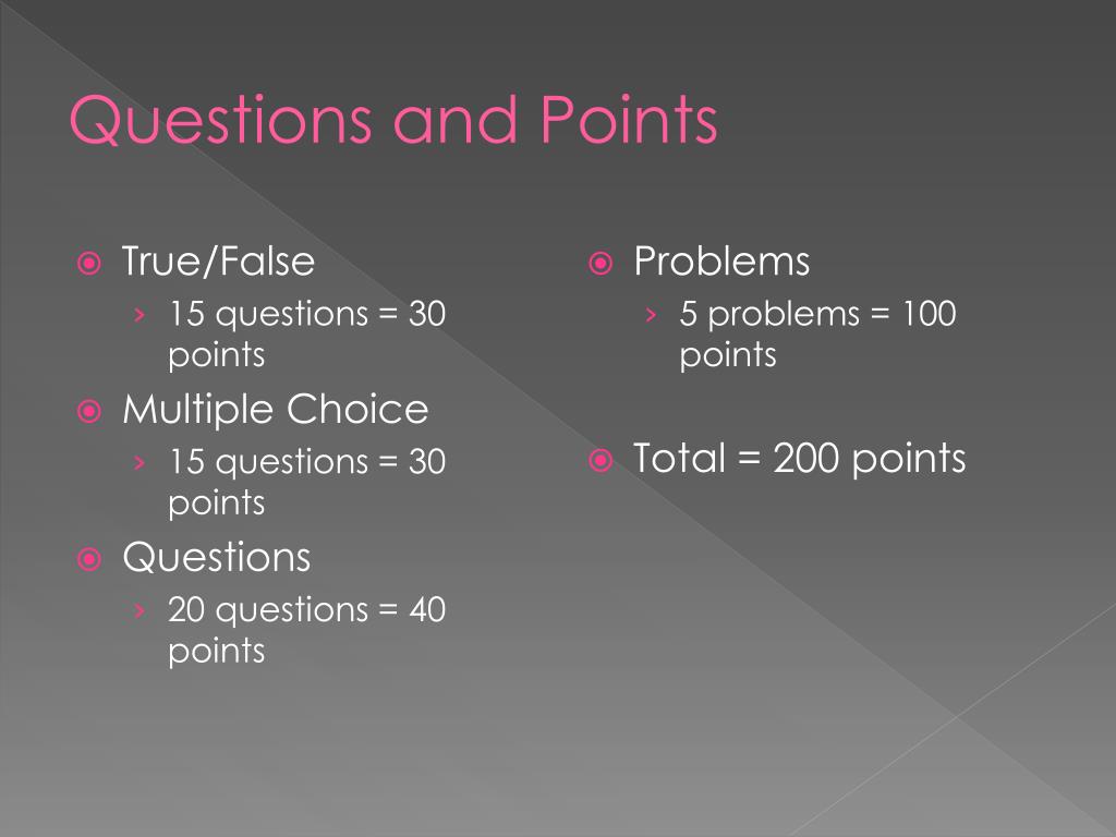 Questions and Points True/False 15 questions = 30 points Multiple Choice 15 questions = 30 points Questions 20 questions = 40 points Problems 5 problems = 100 points Total = 200 points