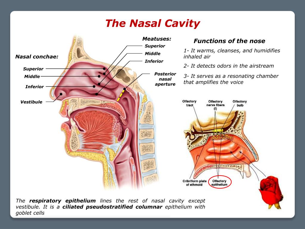 The Nasal Cavity Meatuses: Functions of the nose • 1- It warms, cleanses, and humidifies inhaled air Superior Nasal conchae: Middle • 2- It detects odors in the airstream Inferior • 3- It serves as a resonating chamber that amplifies the voice Superior Posterior nasal aperture Middle Inferior Vestibule The respiratory epithelium lines the rest of nasal cavity except vestibule. It is a ciliated pseudostratified columnar epithelium with goblet cells