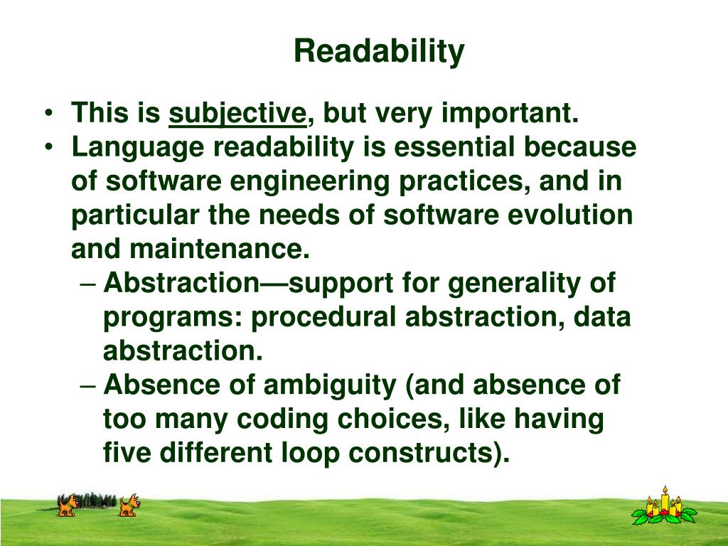 Readability • This is subjective, but very important. • Language readability is essential because of software engineering practices, and in particular the needs of software evolution and maintenance. • Abstraction—support for generality of programs: procedural abstraction, data abstraction. • Absence of ambiguity (and absence of too many coding choices, like having five different loop constructs).