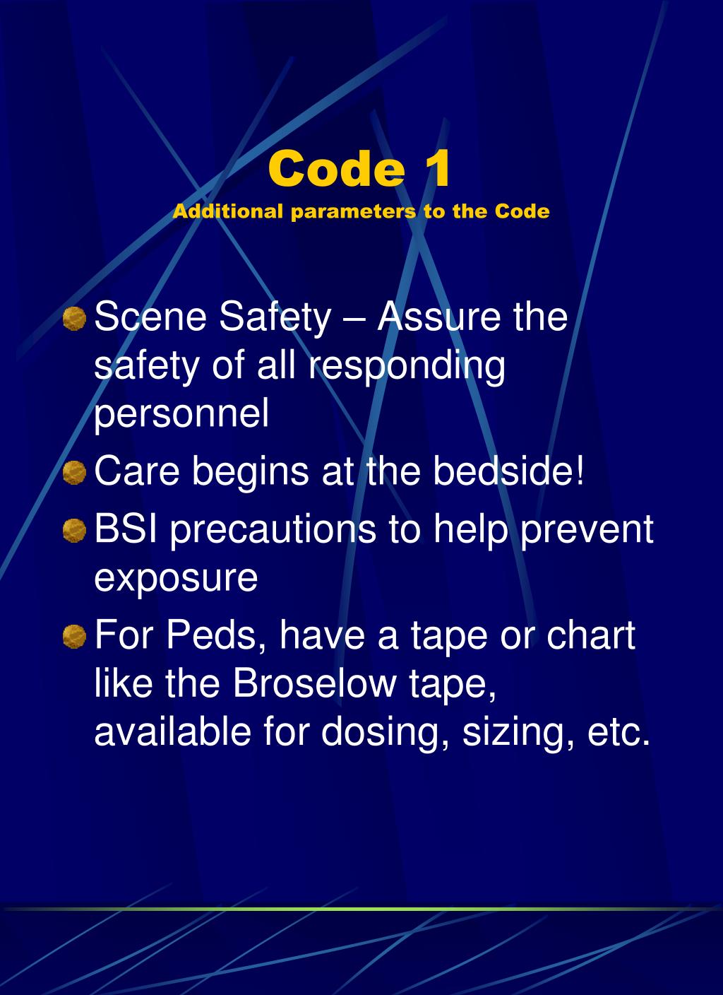 Code 1Additional parameters to the Code • Scene Safety – Assure the safety of all responding personnel • Care begins at the bedside! • BSI precautions to help prevent exposure • For Peds, have a tape or chart like the Broselow tape, available for dosing, sizing, etc.