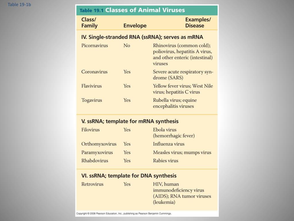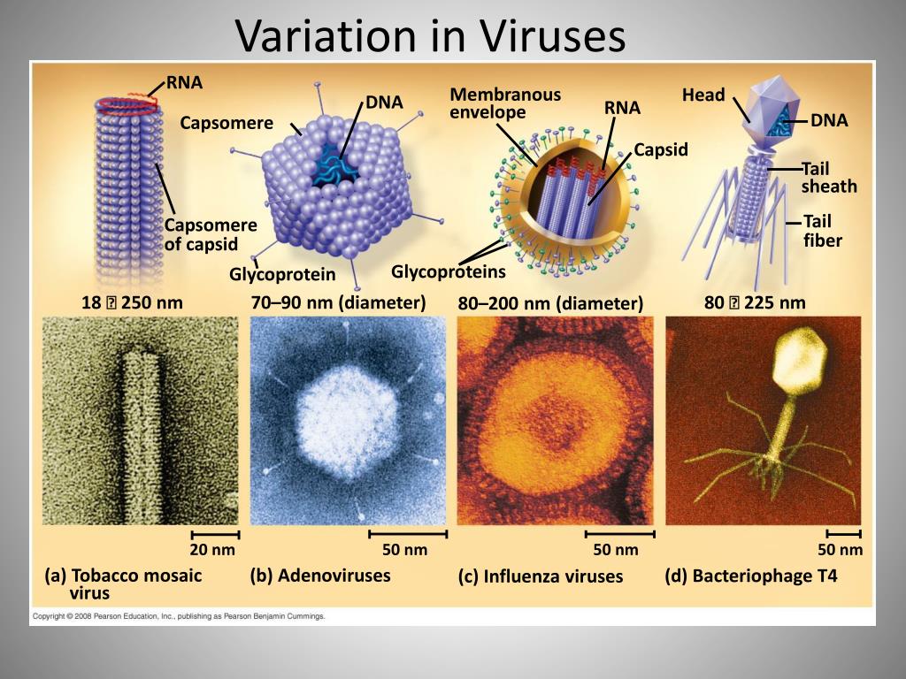 Variation in Viruses RNA Membranous envelope Head DNA RNA DNA Capsomere Capsid Tail sheath Tail fiber Capsomere of capsid Glycoproteins Glycoprotein 18 250 nm 70–90 nm (diameter) 80 225 nm 80–200 nm (diameter) 20 nm 50 nm 50 nm 50 nm (a) Tobacco mosaic virus (b) Adenoviruses (d) Bacteriophage T4 (c) Influenza viruses