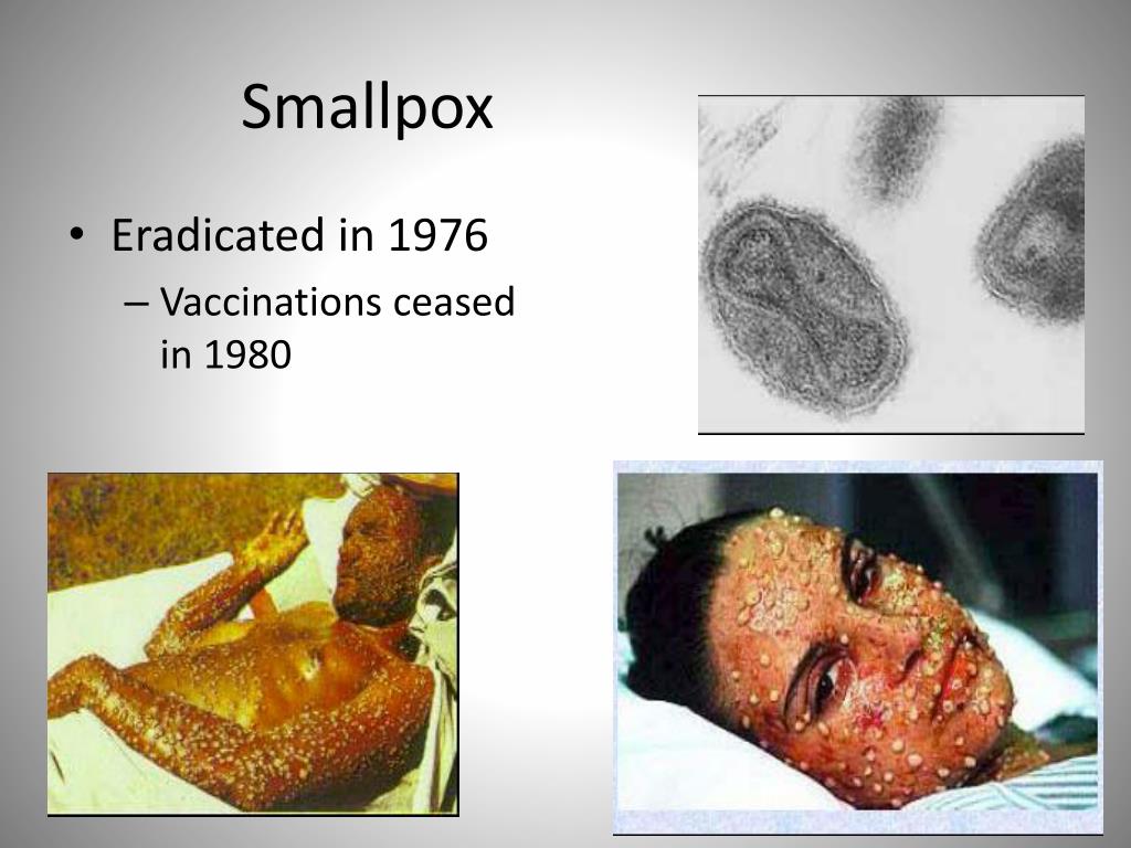 Smallpox • Eradicated in 1976 • Vaccinations ceased in 1980