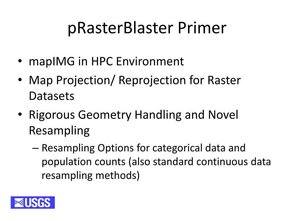pRasterBlaster Primer • mapIMG in HPC Environment • Map Projection/ Reprojection for Raster Datasets • Rigorous Geometry Handling and Novel Resampling • Resampling Options for categorical data and population counts (also standard continuous data resampling methods)