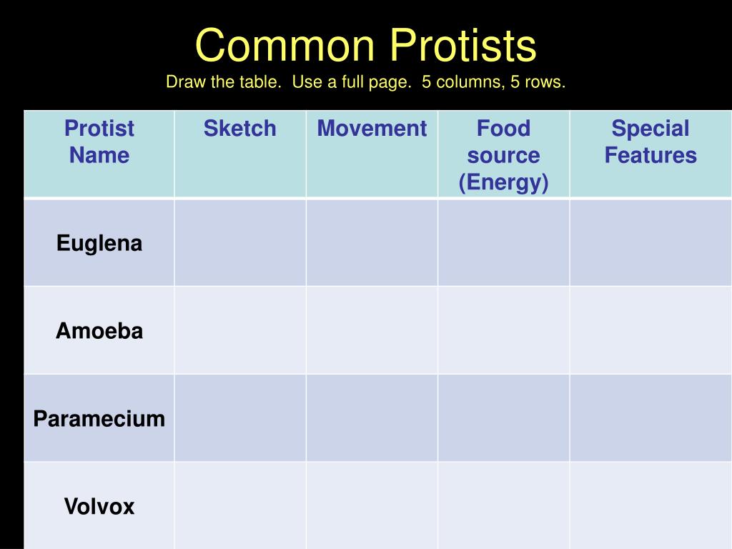 Common ProtistsDraw the table. Use a full page. 5 columns, 5 rows.