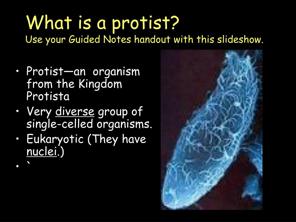 What is a protist?Use your Guided Notes handout with this slideshow. • Protist—an organism from the Kingdom Protista • Very diverse group of single-celled organisms. • Eukaryotic (They have nuclei.) • `
