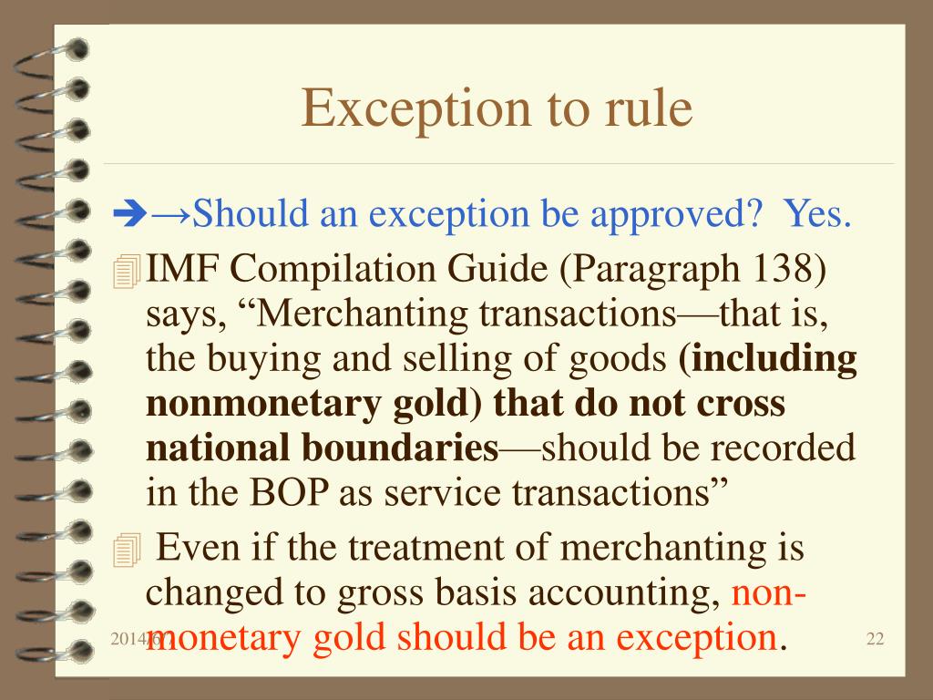 Exception to rule • →Should an exception be approved? Yes. • IMF Compilation Guide (Paragraph 138) says, “Merchanting transactions—that is, the buying and selling of goods (including nonmonetary gold) that do not cross national boundaries—should be recorded in the BOP as service transactions” • Even if the treatment of merchanting is changed to gross basis accounting, non-monetary gold should be an exception.