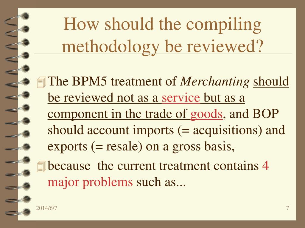 How should the compiling methodology be reviewed? • The BPM5 treatment of Merchantingshould be reviewed not as a service but as a component in the trade of goods, and BOP should account imports (= acquisitions) and exports (= resale) on a gross basis, • becausethe currenttreatment contains 4 major problems such as...