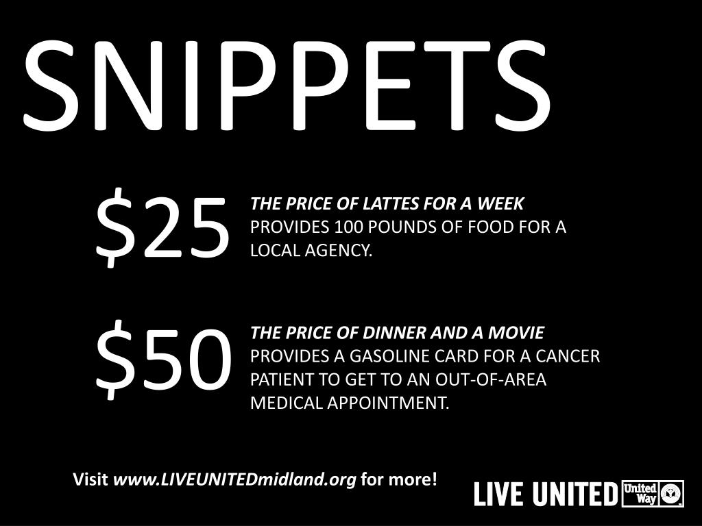 SNIPPETS $25 THE PRICE OF LATTES FOR A WEEK PROVIDES 100 POUNDS OF FOOD FOR A LOCAL AGENCY. $50 THE PRICE OF DINNER AND A MOVIE PROVIDES A GASOLINE CARD FOR A CANCER PATIENT TO GET TO AN OUT-OF-AREA MEDICAL APPOINTMENT. Visit www.LIVEUNITEDmidland.org for more!
