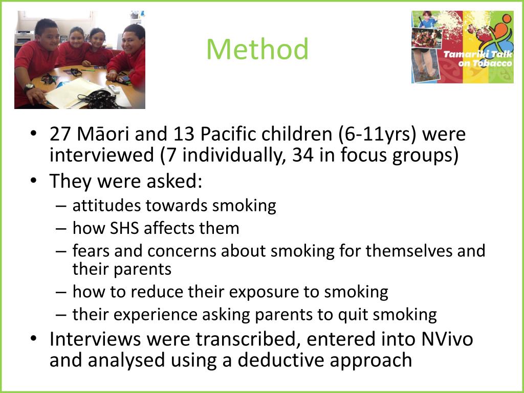 Method • 27 Māori and 13 Pacific children (6-11yrs) were interviewed (7 individually, 34 in focus groups) • They were asked: • attitudes towards smoking • how SHS affects them • fears and concerns about smoking for themselves and their parents • how to reduce their exposure to smoking • their experience asking parents to quit smoking • Interviews were transcribed, entered into NVivo and analysed using a deductive approach