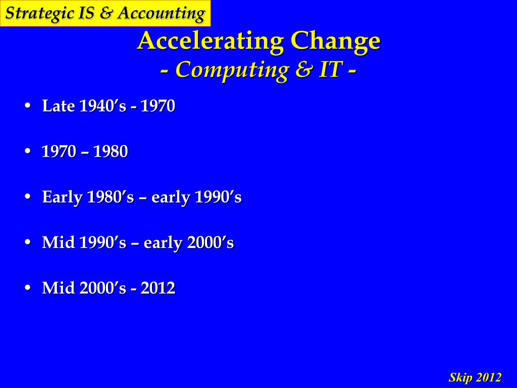 Accelerating Change - Computing & IT - • Late 1940’s - 1970 • 1970 – 1980 • Early 1980’s – early 1990’s • Mid 1990’s – early 2000’s • Mid 2000’s - 2012