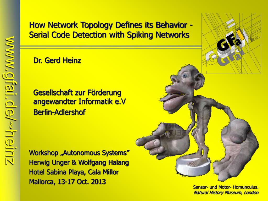 How Network Topology Defines its Behavior -Serial Code Detection with Spiking Networks Dr. Gerd Heinz Gesellschaft zur Förderung angewandter Informatik e.V Berlin-Adlershof Workshop „Autonomous Systems” Herwig Unger & Wolfgang Halang Hotel Sabina Playa, Cala Millor Mallorca, 13-17 Oct. 2013 Sensor- und Motor- Homunculus. Natural History Museum, London