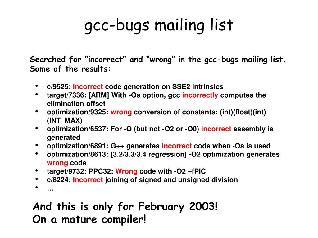 gcc-bugs mailing list Searched for “incorrect” and “wrong” in the gcc-bugs mailing list. Some of the results: • c/9525: incorrect code generation on SSE2 intrinsics • target/7336: [ARM] With -Os option, gcc incorrectly computes the elimination offset • optimization/9325: wrong conversion of constants: (int)(float)(int) (INT_MAX) • optimization/6537: For -O (but not -O2 or -O0) incorrect assembly is generated • optimization/6891: G++ generates incorrect code when -Os is used • optimization/8613: [3.2/3.3/3.4 regression] -O2 optimization generates wrong code • target/9732: PPC32: Wrong code with -O2 –fPIC • c/8224: Incorrect joining of signed and unsigned division • … And this is only for February 2003! On a mature compiler!