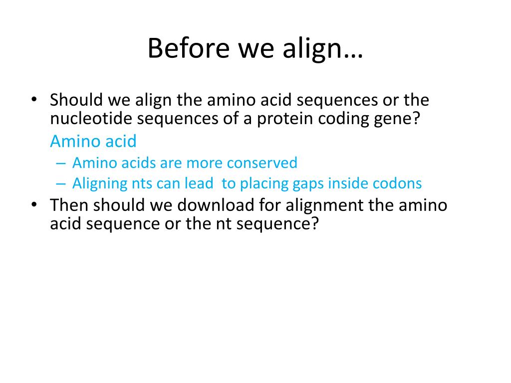 Before we align… • Should we align the amino acid sequences or the nucleotide sequences of a protein coding gene? • Amino acid • Amino acids are more conserved • Aligning nts can lead to placing gaps inside codons • Then should we download for alignment the amino acid sequence or the nt sequence? Nucleotide. • The nucleotide sequence gives us the ability to • Detect silent mutations • Detect frame shifts (rare but can occur in defunct genes) • We can translate the sequence offline