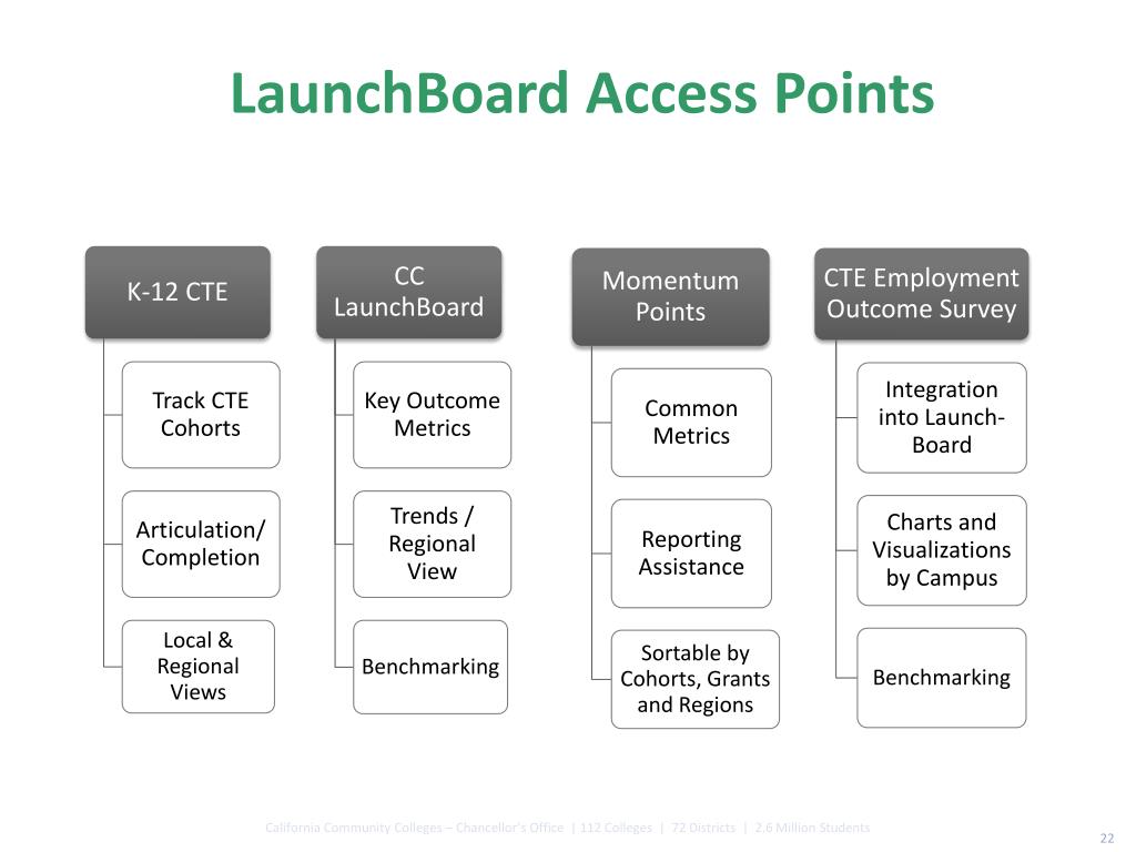 LaunchBoard Access Points California Community Colleges – Chancellor’s Office | 112 Colleges | 72 Districts | 2.6 Million Students