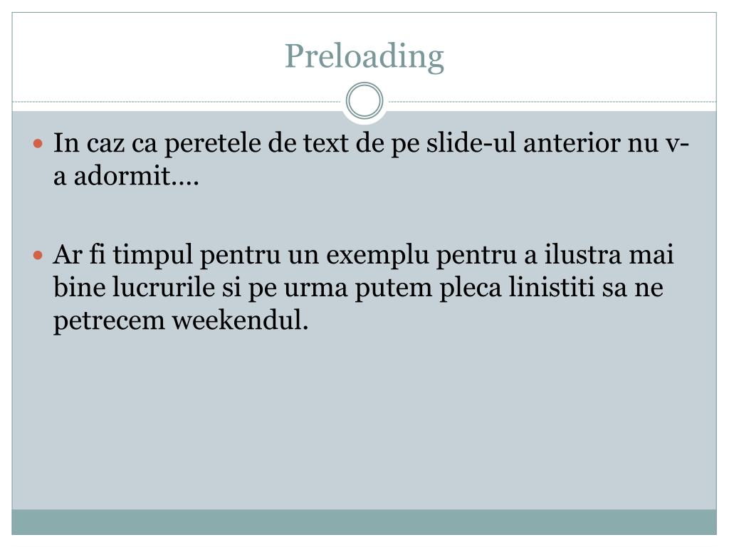 Preloading In caz ca peretele de text de pe slide-ul anterior nu v-a adormit…. Arfitimpulpentru un exemplupentru a ilustramaibinelucrurilesipeurmaputemplecalinistitisa ne petrecemweekendul.