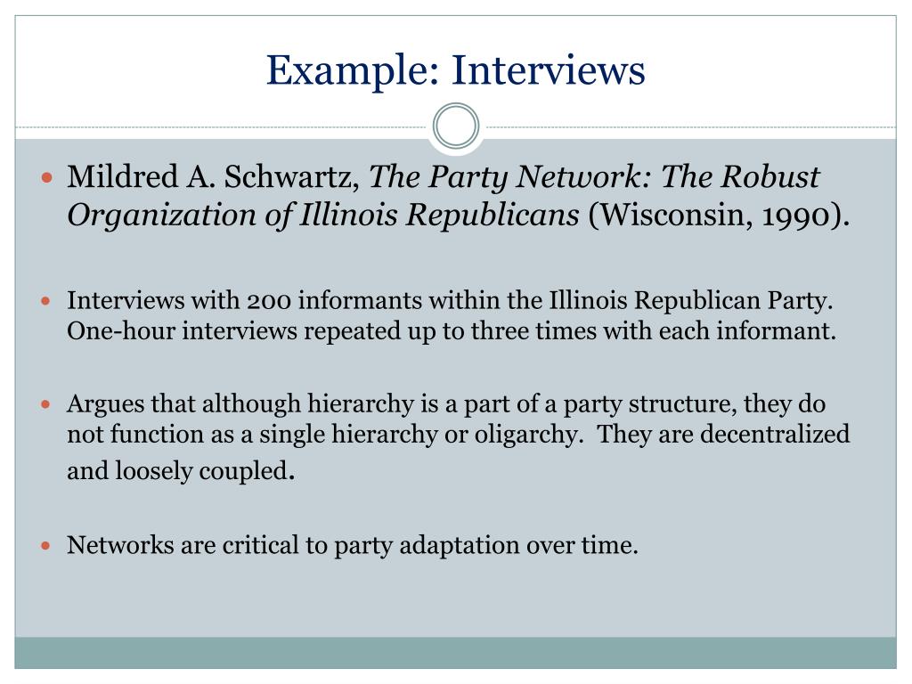 Example: Interviews Mildred A. Schwartz, The Party Network: The Robust Organization of Illinois Republicans (Wisconsin, 1990). Interviews with 200 informants within the Illinois Republican Party. One-hour interviews repeated up to three times with each informant. Argues that although hierarchy is a part of a party structure, they do not function as a single hierarchy or oligarchy. They are decentralized and loosely coupled. Networks are critical to party adaptation over time.