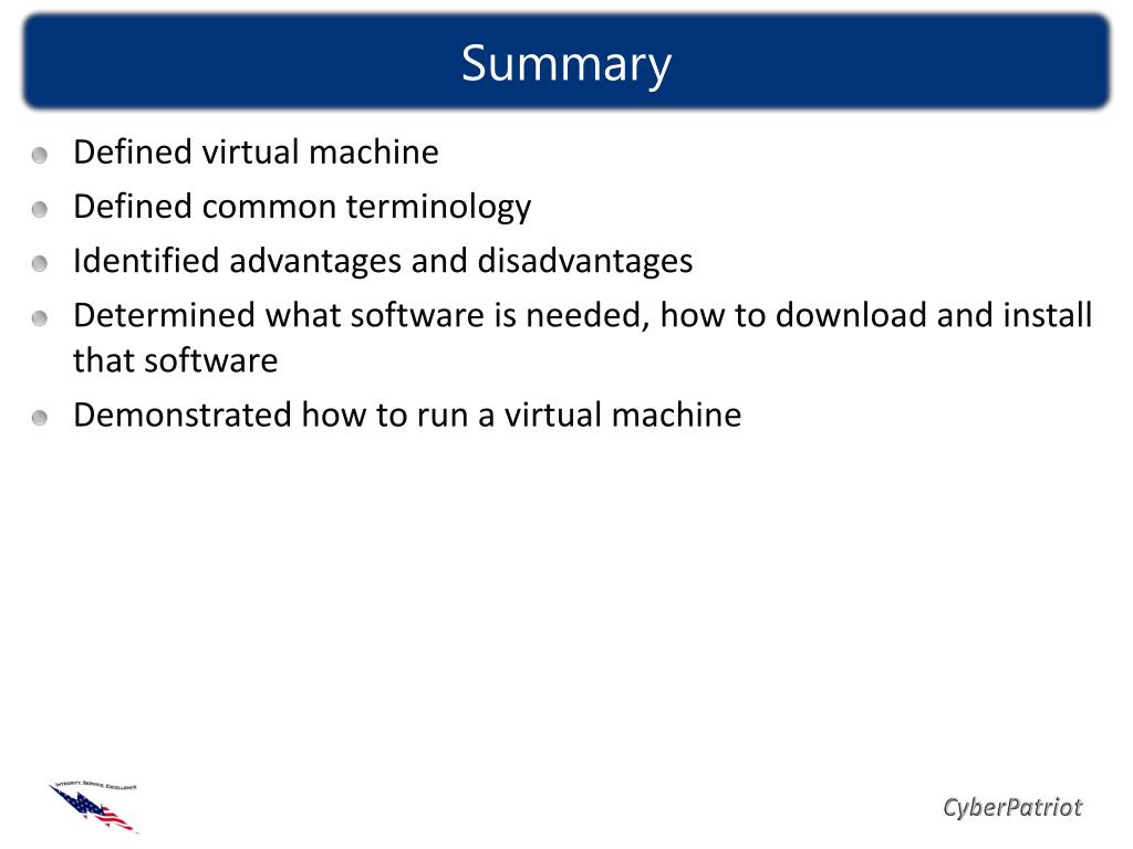 Summary • Defined virtual machine • Defined common terminology • Identified advantages and disadvantages • Determined what software is needed, how to download and install that software • Demonstrated how to run a virtual machine