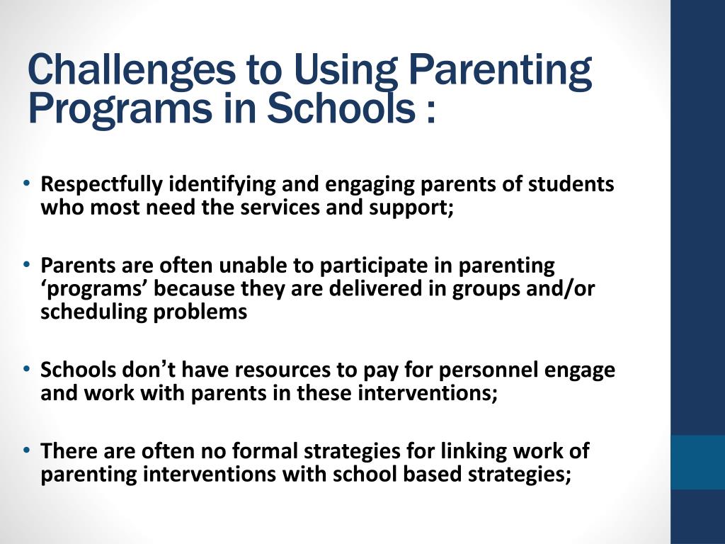 Challenges to Using Parenting Programs in Schools : • Respectfully identifying and engaging parents of students who most need the services and support; • Parents are often unable to participate in parenting ‘programs’ because they are delivered in groups and/or scheduling problems • Schools don’t have resources to pay for personnel engage and work with parents in these interventions; • There are often no formal strategies for linking work of parenting interventions with school based strategies;