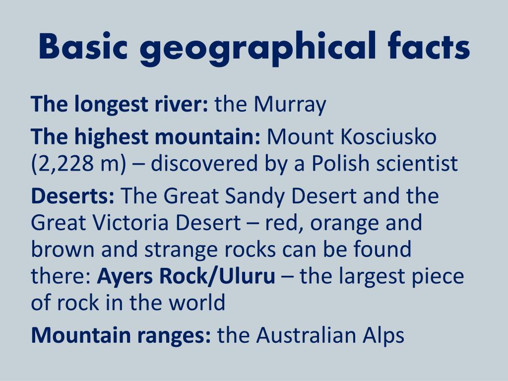 Basic geographicalfacts Thelongestriver: theMurray Thehighestmountain: Mount Kosciusko (2,228 m) – discovered by a Polishscientist Deserts:The Great Sandy Desert and the Great Victoria Desert – red, orange and brown and strangerockscanbefoundthere: Ayers Rock/Uluru– thelargestpieceof rock in theworld Mountainranges: theAustralianAlps