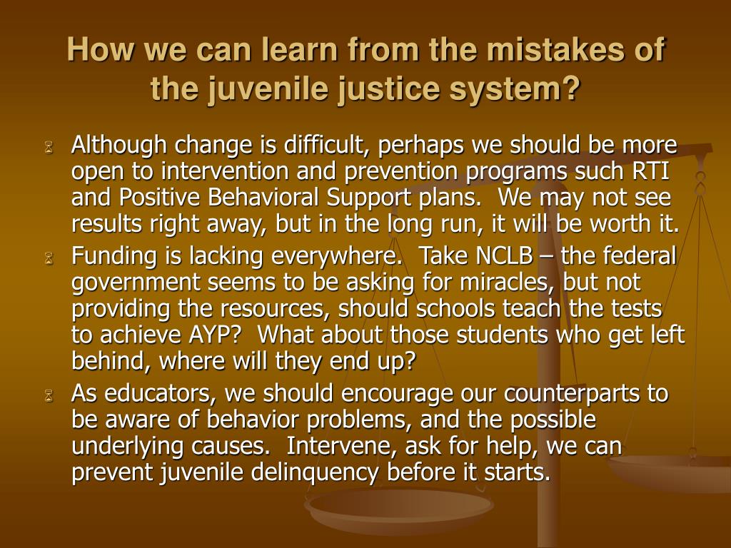 How we can learn from the mistakes of the juvenile justice system? • Although change is difficult, perhaps we should be more open to intervention and prevention programs such RTI and Positive Behavioral Support plans. We may not see results right away, but in the long run, it will be worth it. • Funding is lacking everywhere. Take NCLB – the federal government seems to be asking for miracles, but not providing the resources, should schools teach the tests to achieve AYP? What about those students who get left behind, where will they end up? • As educators, we should encourage our counterparts to be aware of behavior problems, and the possible underlying causes. Intervene, ask for help, we can prevent juvenile delinquency before it starts.