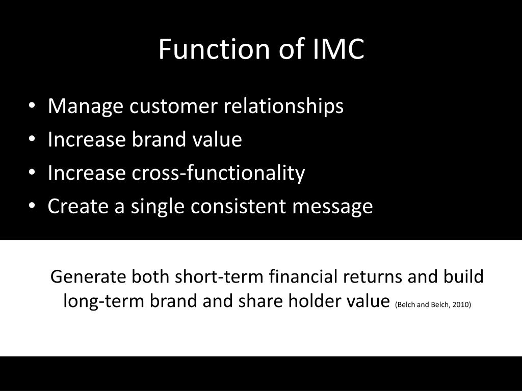 Function of IMC • Manage customer relationships • Increase brand value • Increase cross-functionality • Create a single consistent message Generate both short-term financial returns and build long-term brand and share holder value (Belch and Belch, 2010)