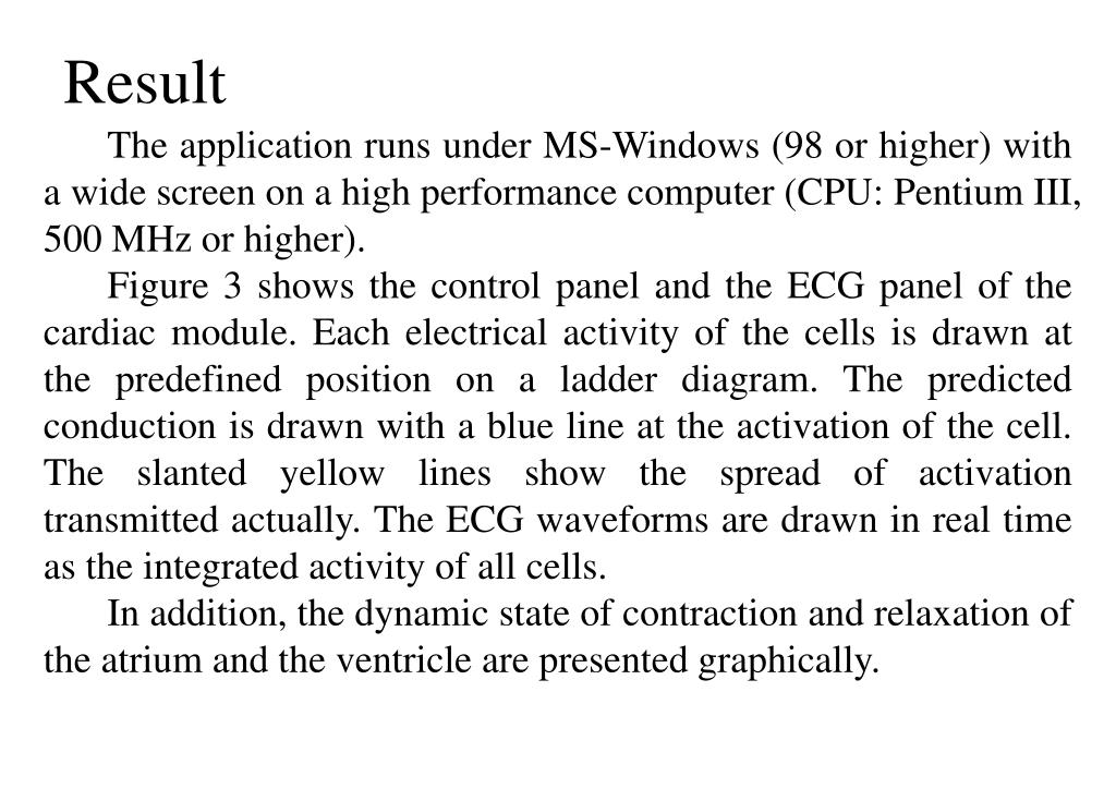The application runs under MS-Windows (98 or higher) with a wide screen on a high performance computer (CPU: Pentium III, 500 MHz or higher). Figure 3 shows the control panel and the ECG panel of the cardiac module. Each electrical activity of the cells is drawn at the predefined position on a ladder diagram. The predicted conduction is drawn with a blue line at the activation of the cell. The slanted yellow lines show the spread of activation transmitted actually. The ECG waveforms are drawn in real time as the integrated activity of all cells. In addition, the dynamic state of contraction and relaxation of the atrium and the ventricle are presented graphically. Result