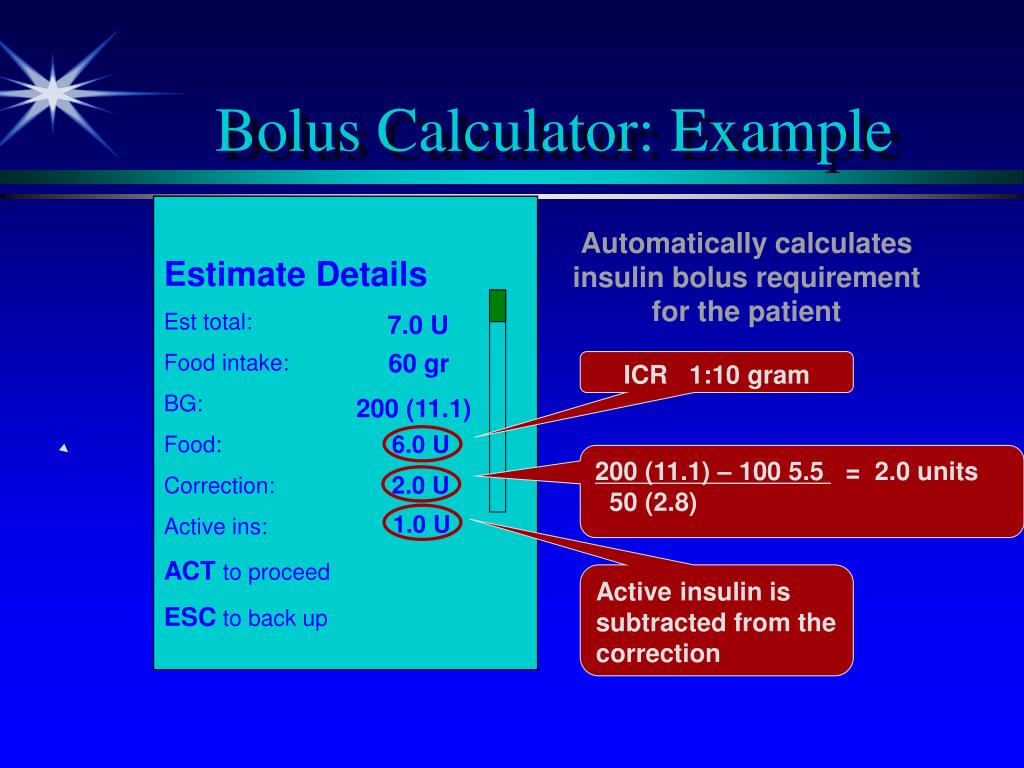 Bolus Calculator: Example Estimate Details Est total: Food intake: BG: Food: Correction: Active ins: ACT to proceed ESC to back up Automatically calculates insulin bolus requirementfor the patient 7.0 U 60 gr ICR 1:10 gram 200 (11.1) 6.0 U 200 (11.1) – 100 5.5 = 2.0 units 50 (2.8) 2.0 U 1.0 U Active insulin is subtracted from the correction