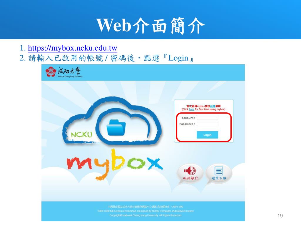 Web介面簡介 1. https://mybox.ncku.edu.tw 2. 請輸入已啟用的帳號 / 密碼後,點選『Login』