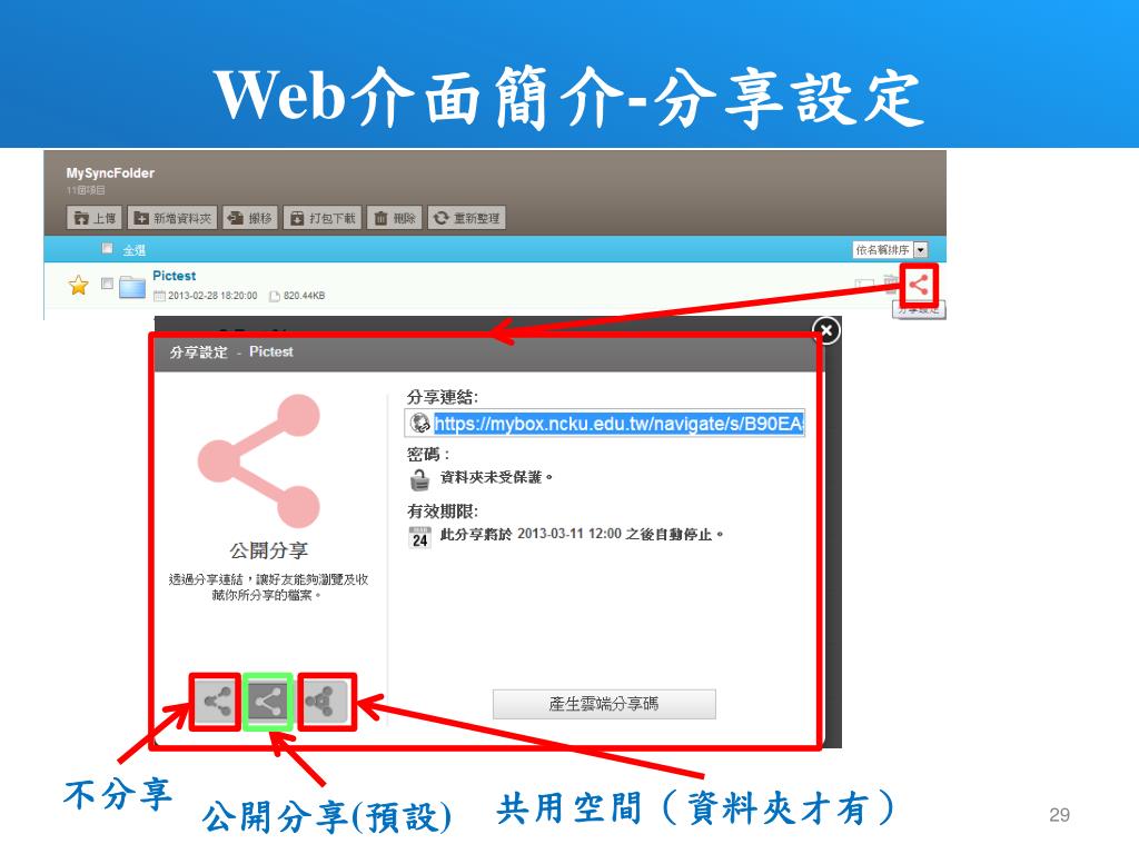 Web介面簡介-分享設定 不分享 共用空間(資料夾才有) 公開分享(預設)