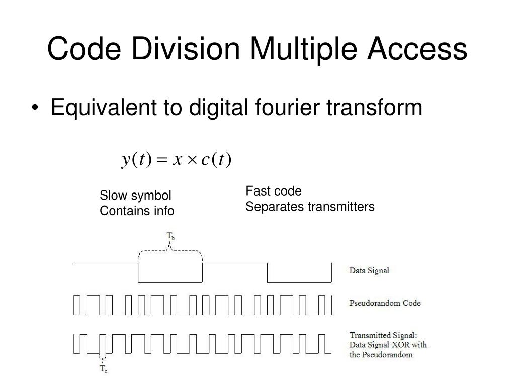 Code Division Multiple Access • Equivalent to digital fourier transform Fast code Separates transmitters Slow symbol Contains info