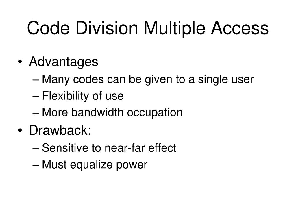 Code Division Multiple Access • Advantages • Many codes can be given to a single user • Flexibility of use • More bandwidth occupation • Drawback: • Sensitive to near-far effect • Must equalize power