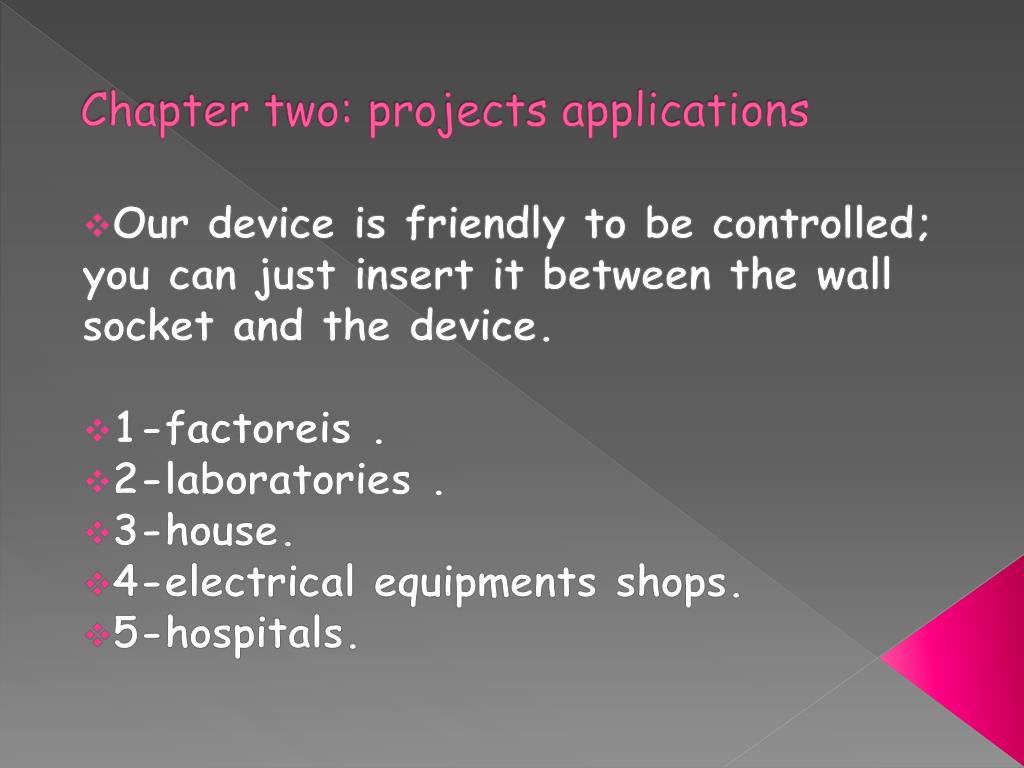 Chapter two: projects applications Our device is friendly to be controlled; you can just insert it between the wall socket and the device. 1-factoreis . 2-laboratories . 3-house. 4-electrical equipments shops. 5-hospitals.