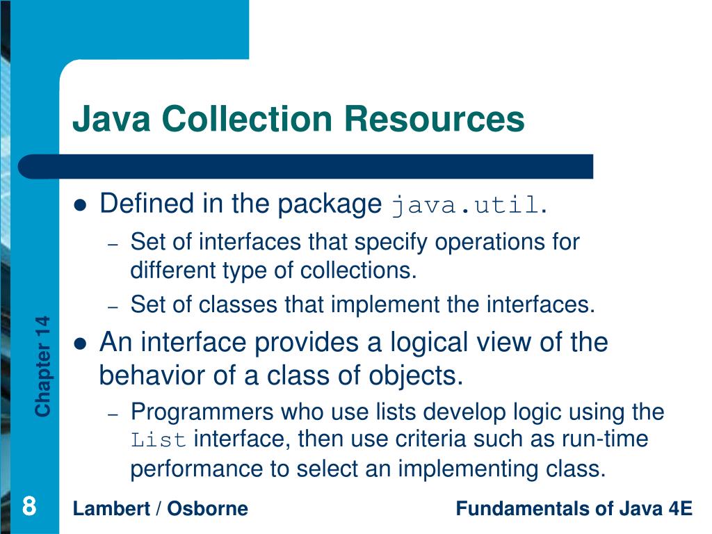 Chapter 14 Introduction to Collections. Fundamentals of Java: AP Computer Science Essentials, 4th Edition. Lambert / Osborne. Objectives. Recognize different categories of collections and the operations on them Distinguish between a collection’s interface and its implementing classes