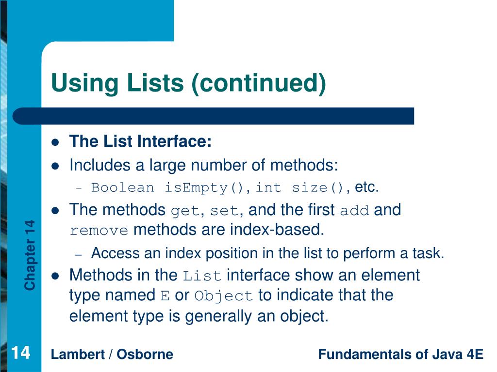 Using Lists (continued) • The List Interface: • Includes a large number of methods: • Boolean isEmpty(), int size(), etc. • The methods get, set, and the first add and remove methods are index-based. • Access an index position in the list to perform a task. • Methods in the List interface show an element type named E or Object to indicate that the element type is generally an object. 14 14