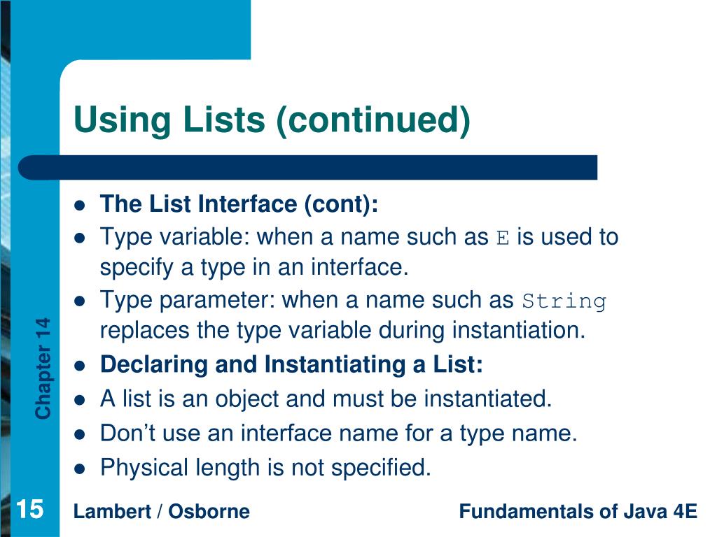 Using Lists (continued) • The List Interface (cont): • Type variable: when a name such as E is used to specify a type in an interface. • Type parameter: when a name such as String replaces the type variable during instantiation. • Declaring and Instantiating a List: • A list is an object and must be instantiated. • Don’t use an interface name for a type name. • Physical length is not specified. 15 15