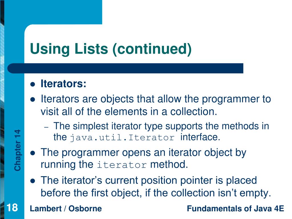 Using Lists (continued) • Lists and Primitive Types: • Unlike arrays, lists can contain only objects, not values of primitive type, such as int or double. • Primitive Types and Wrapper Classes: • Wrapper class: used to store primitive data types in a list. • A class that contains a value of primitive type. • Use the appropriate wrapper class name as the element type parameter. 17 17