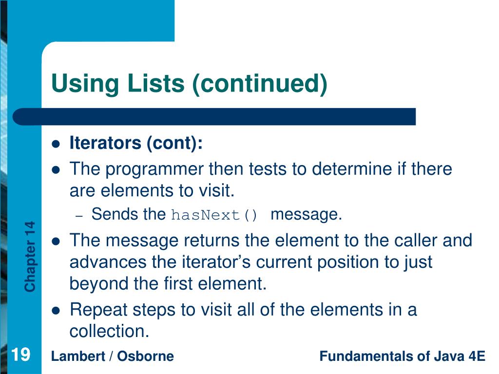 Using Lists (continued) • Iterators: • Iterators are objects that allow the programmer to visit all of the elements in a collection. • The simplest iterator type supports the methods in the java.util.Iterator interface. • The programmer opens an iterator object by running the iterator method. • The iterator’s current position pointer is placed before the first object, if the collection isn’t empty. 18 18