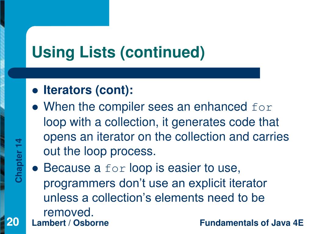 Using Lists (continued) • Iterators (cont): • The programmer then tests to determine if there are elements to visit. • Sends the hasNext() message. • The message returns the element to the caller and advances the iterator’s current position to just beyond the first element. • Repeat steps to visit all of the elements in a collection. 19 19