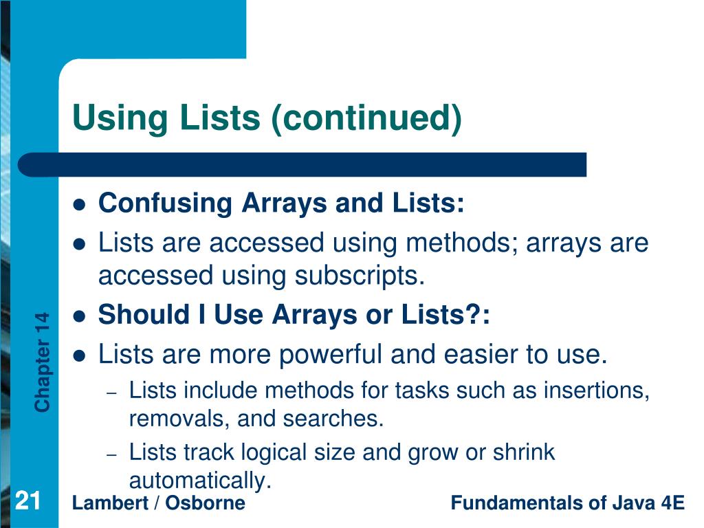 Using Lists (continued) • Iterators (cont): • When the compiler sees an enhanced for loop with a collection, it generates code that opens an iterator on the collection and carries out the loop process. • Because a for loop is easier to use, programmers don’t use an explicit iterator unless a collection’s elements need to be removed. 20 20
