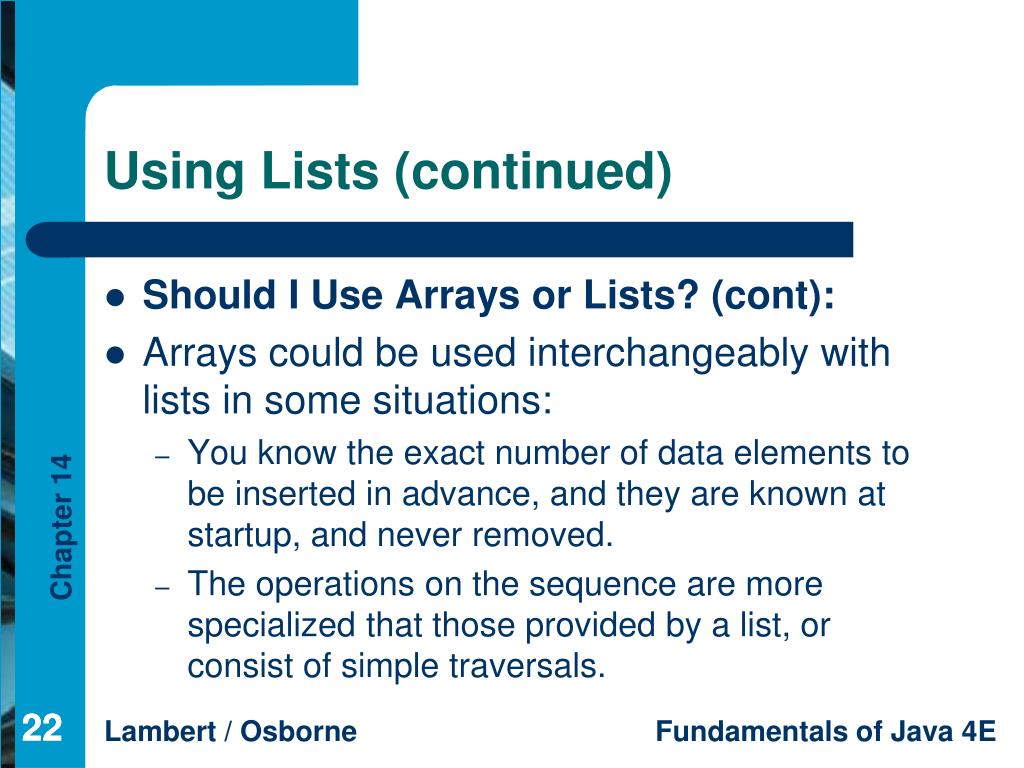 Using Lists (continued) • Should I Use Arrays or Lists? (cont): • Arrays could be used interchangeably with lists in some situations: • You know the exact number of data elements to be inserted in advance, and they are known at startup, and never removed. • The operations on the sequence are more specialized that those provided by a list, or consist of simple traversals. 22 22