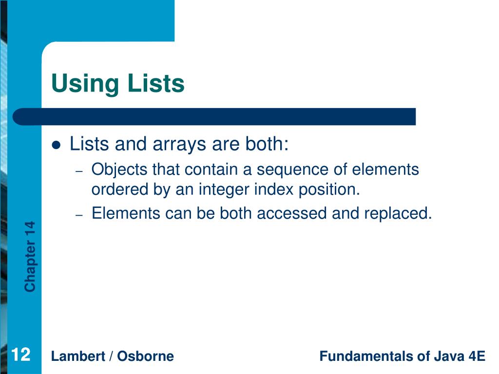 Using Lists • Lists and arrays are both: • Objects that contain a sequence of elements ordered by an integer index position. • Elements can be both accessed and replaced. 12 12