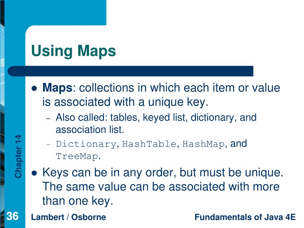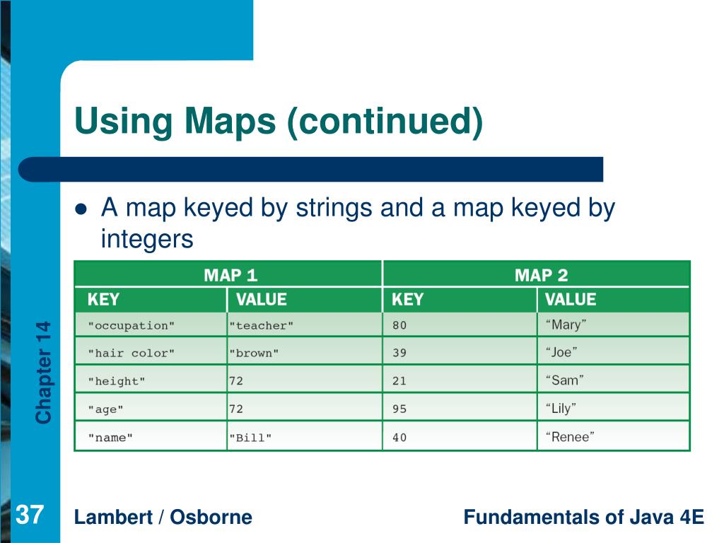 Using Maps • Maps: collections in which each item or value is associated with a unique key. • Also called: tables, keyed list, dictionary, and association list. • Dictionary, HashTable, HashMap, and TreeMap. • Keys can be in any order, but must be unique. The same value can be associated with more than one key. 36 36